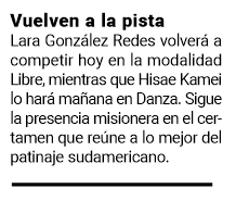Las patinadoras de la Federación Misionera de Patinaje (FeMiPat) Lara González Redes y Hisae Kamei, integrantes del Seleccionado Argentino de Patinaje, sumaron dos nuevas preseas al medallero argentino en el Torneo Sudamericano de Patinaje Artístico 2023, que se disputa en Asunción, Paraguay.