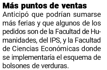Deslizó además que “hoy tenemos más de 100 ferias”, de las cuales 25 están en Posadas, y anticipó que podrían sumarse más ferias y que algunos de los pedidos son de la Facultad de Humanidades, del IPS, y la Facultad de Ciencias Económicas donde se implementaría el esquema de bolsones de verduras.