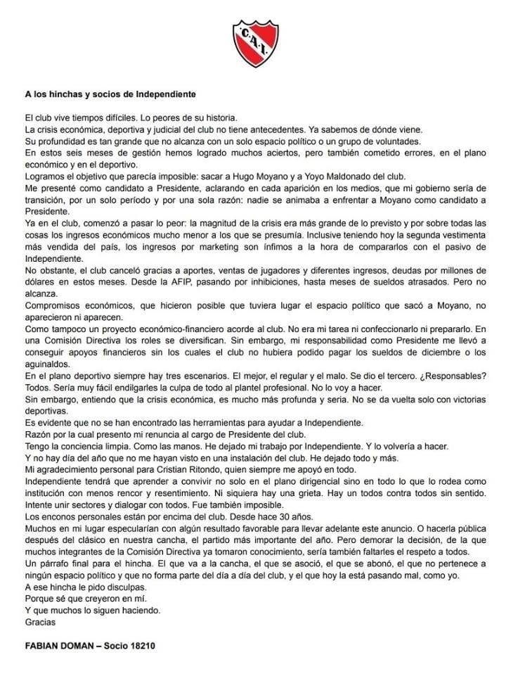 En la tarde de este martes, una bomba explotó en el mundo Independiente, Fabián Doman presentó su renuncia como presidentea partir de un comunicado donde asegura que “es evidente que no se han encontrado las herramientas para ayudar a Independiente. Razón por la cual presento mi renuncia al cargo de presidente del club”.