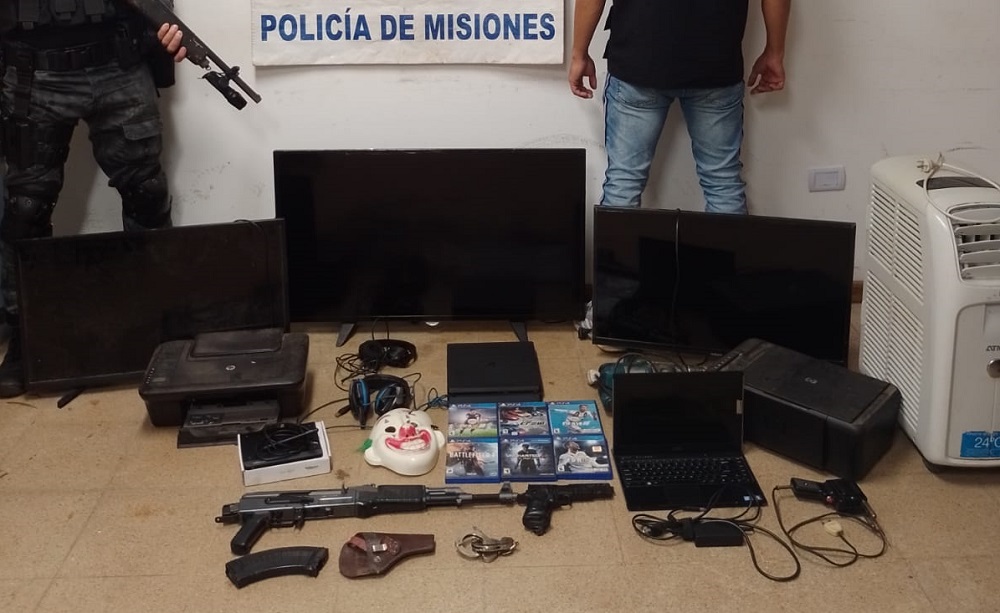 Fue así que cuando los agentes recabaron datos certeros del paradero del autor, mediante orden del Juzgado de Instrucción 7 de Posadas, irrumpieron en el inmueble con la colaboración de la Seccional 10ª y el Grupo de Intervención Rápida (GIR), donde incautaron tres televisores, dos impresoras, una notebook, dos auriculares, una esposa de seguridad, un aire portátil, una pizarra digital, un arma de utilería 9mm, un arma de aire comprimido Airsoft VZ58, una pistola para soldar, una consola de videojuegos y un taladro.