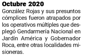 El martes 6 de octubre de 2020, los gendarmes fueron a buscarlo a Jardín América. González Rojas estaba dentro de una propiedad que contaba con un paredón alto y un sistema de cámaras de seguridad. Fue en simultáneo con el decomiso de las casi nueve toneladas de droga en Gobernador Roca.