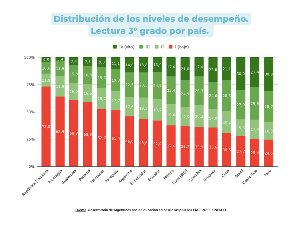 En Argentina el 46% de los alumnos de tercer grado de primaria se ubican en el nivel más bajo de lectura (nivel I) según la prueba regional ERCE. La cifra asciende al 61,5% entre los estudiantes del tercil de menor nivel socioeconómico, mientras que desciende al 26,3% entre los estudiantes del tercil de mayor nivel socioeconómico. Al leer textos adecuados a su edad, los alumnos en el nivel I no son capaces de localizar información o relaciones presentadas literalmente y realizar inferencias a partir de información sugerida, destacada o reiterada.
