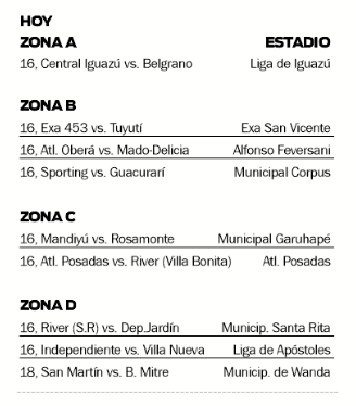 Por su parte, en Zona D jugarán River de Santa Rita vs. Dep. Jardín América, Independiente de Apóstoles vs. Villa Nueva de Iguazú y San Martín de Wanda vs. Mitre.