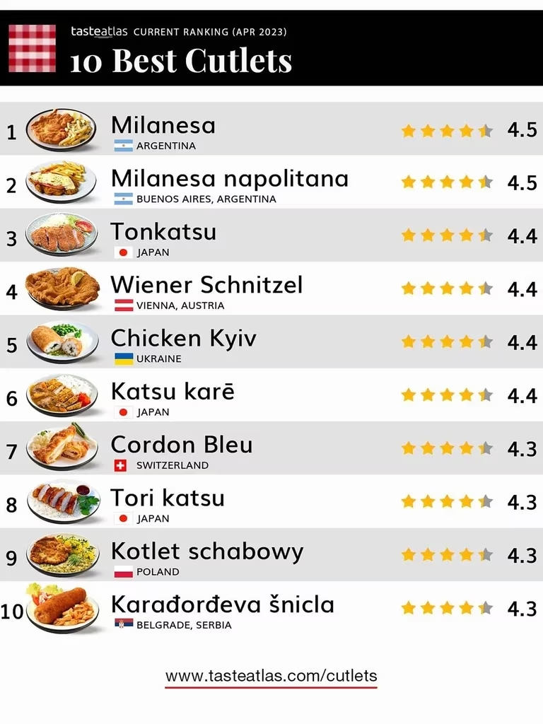 Según la revista especializada en gastronomía, Taste Atlas, la milanesa se destaca entre las carnes rebozadas del mundo, por encima de platos de Japón, Ucrania, Austria, Polonia y Suiza.