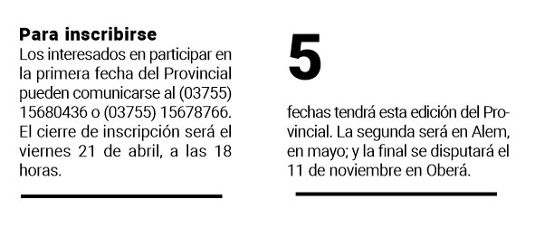 Los interesados en participar pueden comunicarse con Rocío Espíndola (03755) 15680436 o Enzo Oliveira (03755) 15678766. El cierre de inscripción será el viernes 21 de abril, a las 18 horas.