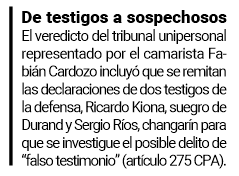 Entre ellos, y tal vez la carta de coartada de Durand, de poco le sirvió ya que el changarín que dijo haberlo acompañado a trabajar en la chacra de su suegro el 26 de junio de 2020, cayó en contradicciones sin precisar en qué vehículo y con cuántas personas. Vaciló entre haber ido “a limpiar un yerbal” en una moto 110 o en un remís con siete personas a bordo. “Pasó mucho tiempo y no recuerdo bien”, intentó defenderse. El testigo de 29 años podría ser acusado por “falso testimonio” ya que el fiscal y el juez Cardozo solicitaron que se lo investigue.