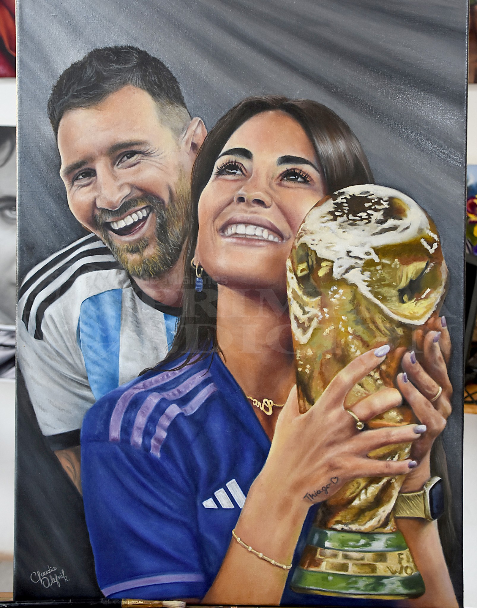 Pero ese inolvidable 18 de diciembre de 2022, Claudia en su corazón hizo otra promesa pero decidió no compartirla y llevarla a cabo sin decirle a nadie: “En mi interior surgió una promesa de que si ganaba iba a pintarle un cuadro que voy a intentar que le llegué y regalarselo, pensé en un principio que se lo iba a pintar con Antonela”. Es así que pintó un segundo cuadro donde se ve a Antonela Roccuzzo, esposa de Lionel Messi con la Copa del Mundo y a su lado el crack rosarino.