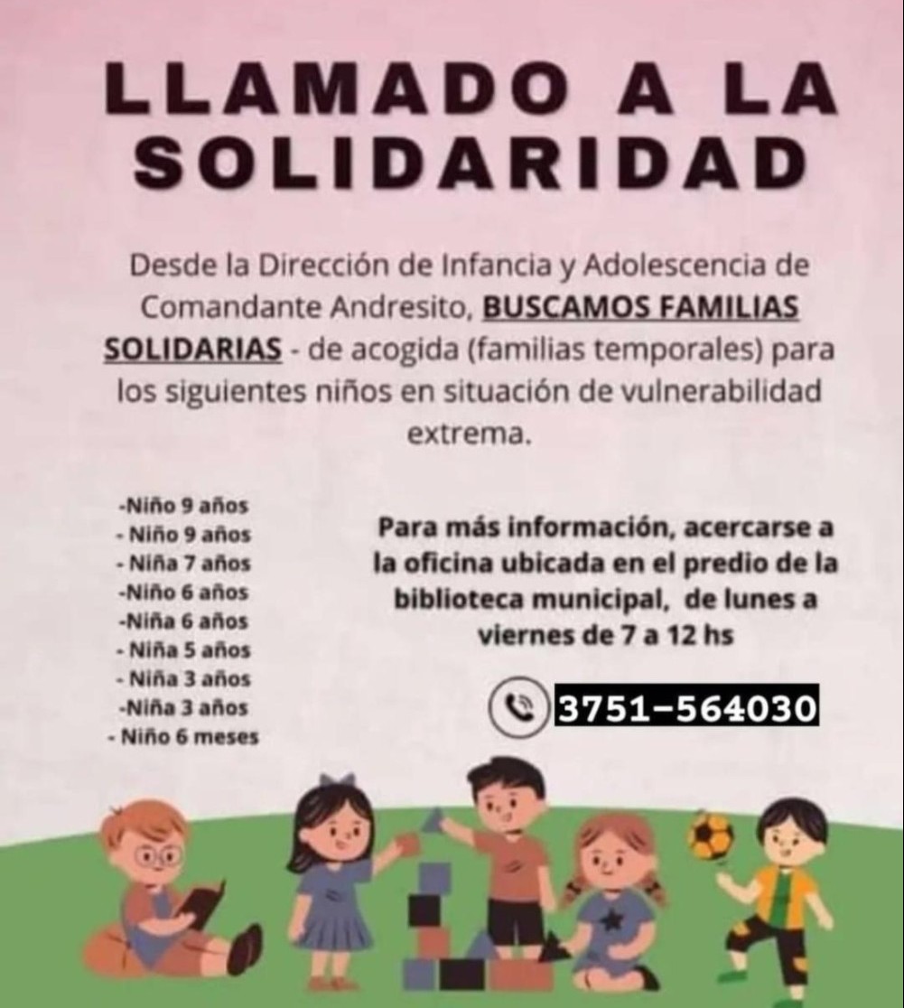 Sobre la búsqueda de familias temporales para estos niños, Cabral dejó en claro que darán prioridad a las familias de Andresito porque buscan no sacar a los niños del municipio para que puedan tener contacto entre sí, para que no pierdan el vínculo y puedan seguir viéndose.