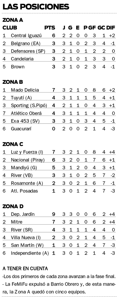 También para destacar la victoria, en la zona C, de Luz y Fuerza de Iguazú sobre uno de los favoritos para pelear el título, Nacional de Puerto Piray, al que goleó 5 a 2, con cuatro goles de quien fue la gran figura de la fecha: Hugo Álvarez; y la remontada de Mado-Delicia frente a Atlético Oberá (perdía al inicio del juego 2-0 y lo ganó 3-2), en la zona B.