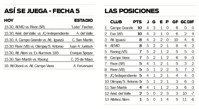 Por su parte, el Exa obereño, el club que ocupa un lugar en la cima, visitará a Atlético Alem. El encuentro se cumplirá en el mismo horario, pero en el estadio Enrique Speyer.