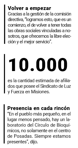 Recordó que desde hace 17 años el afiliado al Sindicato de Luz y Fuerza “tiene que concurrir a un solo laboratorio, no tenía la opción de elegir el que mejor le quedaba o el bioquímico que más le convencía. Desde mayo, todos los laboratorios de Posadas vamos a volver a trabajar de forma libre, y el afiliado también será beneficiado porque tendrá la posibilidad de elegir el laboratorio que le genere más confianza o que esté más cerca de su casa. Es muy conveniente. Por ejemplo, si un afiliado reside en Itaembé Guazú y tiene un laboratorio en la zona, se puede atender ahí, sin necesidad de esperar que un familiar lo deba acercar hasta el centro”.