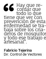 “Debemos recordar que todo lo que tiene que ver con prevención de esta enfermedad se trabaja sobre los criaderos de mosquitos y todo ese trabajo es artesanal; no porque alguien saque una propaganda para que se elimine su criadero, la gente no lo va a hacer”, remarcó.