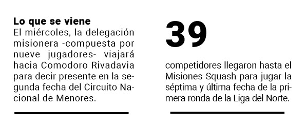Con dos campeones misioneros, ayer se cerró el primer ciclo de la Liga del Norte de Squash: Paula Rivero festejó en M19 Damas y Felipe Piaggi en M13 Varones, pero además hubo varios podios con presencia posadeña. Así se cerró la primera edición del certamen que reúne a lo mejor del squash de la región.