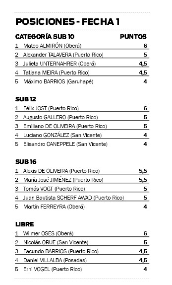 La acción comenzó temprano en la Escuela 654 de San Vicente y tras las seis rondas del torneo, se definieron a los ganadores. En Sub 10, Mateo Almirón de Oberá alcanzó los seis puntos y se subió a lo más alto del podio, seguido por Alexander Talavera de Puerto Rico y Julieta Unternahrer, también de Oberá.