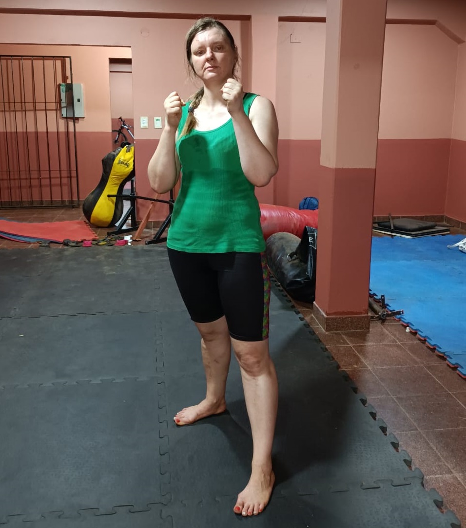 La joven práctica kickboxing, un deporte que, a diferencia del boxeo, combina puños y patadas. Es alumna del profesor Elías Leites (Cinturón Negro 2° Dan), que desarrolla sus clases en el polideportivo municipal de San Vicente. “Comencé a tomar clases en el 2020, cuando él había armado un grupo en un gimnasio, y ahí practicamos con un grupo de chicas. Una de las que empezó a practicar ese deporte era mi amiga. Anteriormente habíamos hecho jiu-jitsu. Luego de la invitación del profesor Leites nos quedamos solamente con kickboxing. La idea de arrancar con ese deporte fue porque desde niña quería hacer artes marciales, pero digamos que en los años 90 era un poco difícil que una chica incursione en ese tema. Sobre todo, mi madre, se oponía a esto, decía que era como cosas de chicos, y no me dejó practicar karate como me hubiera gustado”, contó.
