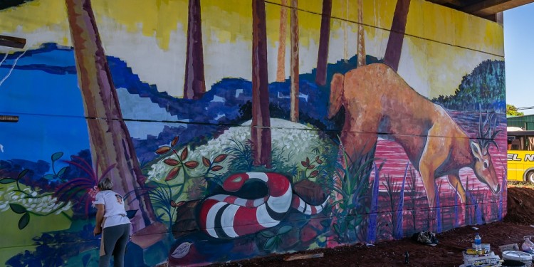 Un impactante mural de varios miles de metros es pintado por estos días, a partir de diseños llevados adelante por artistas de la tierra colorada, en la zona de la exGarita del Kilómetro 10 de la ruta nacional 12, en su intersección con la 105.