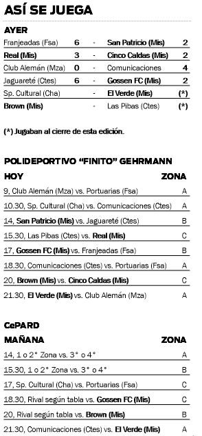 Tras esos dos juegos, el cronograma continuará por la tarde, cuando desde las 14 se midan San Patricio de Posadas ante Deportivo Jaguareté de Corrientes.