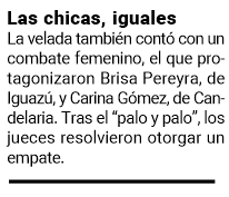 Además, en la categoría hasta 81 kilogramos, Gabriel Vallejos, representante del gimnasio de Iguazú, derrotó por nocaut al apostoleño Nicolás Villalba.