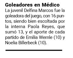 La juvenil Delfina Marcos fue la goleadora del juego, con 16 puntos, siendo bien escoltada por la interna Paola Reyes, que sumó 13, y el aporte infaltable de cada partido de Emilia Wernle (10) y Noelia Billerbeck (10).