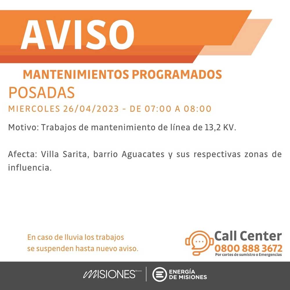 Energía de Misiones comunicó que este miércoles llevarán a cabo tareas de mantenimiento en la línea de 13,2 KV por lo que será necesario interrumpir el servicio en algunas zonas de Posadas.