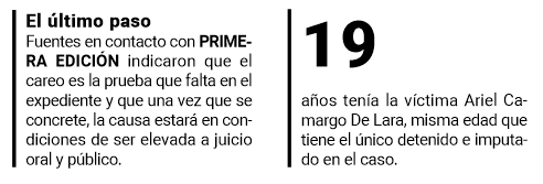 A más de un año del crimen de Ariel Camargo De Lara (19), ocurrido en inmediaciones de un camino vecinal conocido como “Cuatro Bocas” del paraje San Roque de Bernardo de Irigoyen, aún queda una medida antes de que se defina la situación del único imputado que tiene la causa investigada por el juez de Instrucción de San Pedro, Ariel Belda Palomar.