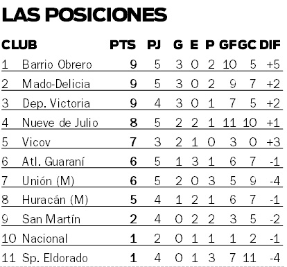 En la continuidad de la quinta fecha de la fase regular del Clasificatorio 2023 de Primera de la Liga de Eldorado, Deportivo Victoria desaprovechó una gran oportunidad para cortarse en la cima, sufrió su primera derrota y lo alcanzaron Barrio Obrero de Esperanza y Asociación de Clubes Mado-Delicia.