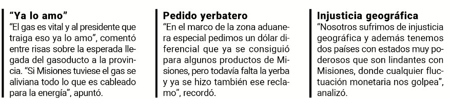 Pero puso énfasis en la importancia de conseguir el gasoducto para Misiones, la única provincia donde la red “nunca llega”. “Lo del gas es dramático. Es el tema (central) porque hace crecer el desarrollo”, opinó y amplió: “Misiones era la economía número 18. Hoy es la séptima del país, por el esfuerzo de los misioneros y las mujeres misioneras muy especialmente, y eso es algo que conseguimos sin gas”.