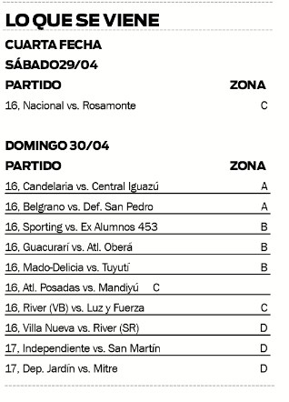 En tanto, en cancha de La Picada, Andrés Guacurarí de Posadas enfrentará a Atlético Oberá, por la B. Por el mismo grupo, Sporting será anfitrión de Ex Alumnos 453 de San Vicente, desde las 16.
