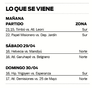 En su cancha, Timbó buscará mantenerse en lo más alto de las posiciones cuando reciba mañana, desde las 21 al elenco de Puerto Leoni. Mientras que en otro adelanto, en el estadio Municipal de Capioví, el escolta Deportivo Jardín visitará a Papel Misionero, desde las 22.