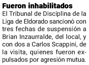 Por su parte, sancionaron con tres fechas a Brian Inzaurralde, del local, y dos a Carlos Scappini, de la visita, quienes fueron expulsados por agresión mutua. También fue suspendido, con cuatro jornadas, Facundo Jurado.