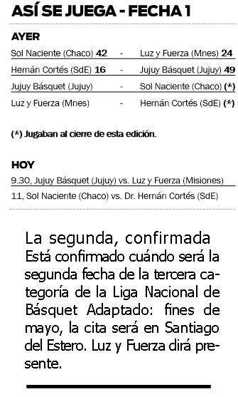 Por la mañana, el representante misionero, Luz y Fuerza, no pudo en su debut ante Sol Naciente de Chaco y cayó por 42 a 24; mientras que Jujuy Básquet, de Jujuy, venció a Hernán Cortés de Santiago del Estero por 49 a 16. Anoche, al cierre de esta edición, Jujuy Básquet iba en busca de su segundo triunfo ante Sol Naciente, y Luz y Fuerza, por la recuperación, ante Hernán Cortés.