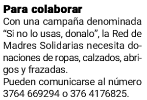 Con una importante necesidad en los barrios capitalinos, la Red de Madres Solidarias realiza a lo largo del año diferentes campañas solidarias para llevar a los más necesitados. Sumado al pedido de útiles escolares, para armar cartucheras y entregar a la vuelta del receso de invierno, están realizando una colecta de ropas, calzados, abrigos y frazadas para llevar a diferentes puntos de Posadas, donde funcionan percheros solidarios.