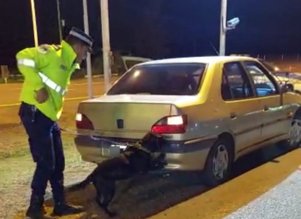 Pidieron la colaboración de un camarada que se acercó al automóvil en compañía de “Jana” una perra detectora de estupefacientes. Cuando el animal pasó cerca de los paragolpes reaccionó ante la posible presencia de narcóticos.