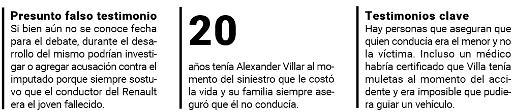 Entre los testimonios clave que orientaron la investigación al sobreviviente, hay testimonios que aseguran que, al momento del hecho, la víctima fatal cursaba una recuperación debido a una operación en una de sus rodillas y se movilizaba con muletas. Además, que no conducía pese a saber hacerlo y como si fuera poco, que el próximo encartado lo hacía desde temprana edad, incluso antes de los 12 o 13 años.