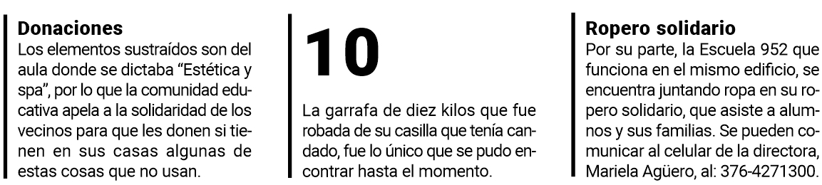 “Estoy hace un año justo y sé que suelen ingresar menores de edad, niños a jugar en el predio, no robaron nada, pero sí rompieron cosas. En las gestiones anteriores hubo varios hechos. Hay cámaras en la escuela que los menores intentaron romper, lo que hicimos fue poner un vidrio blindado a una de las cámaras”, contó la directora.