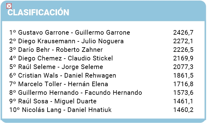 La competencia se realizó el sábado y contó con la participación de 16 equipos. Los ganadores totalizaron 16 especies y completaron seis cupos para quedarse con la jornada. La curiosidad de la fecha fue que un mismo equipo capturó las piezas mayores de escama y cuero. Behr y Zahner fiscalizaron una morena rubia de 47 centímetros y un armado de 42 centímetros.