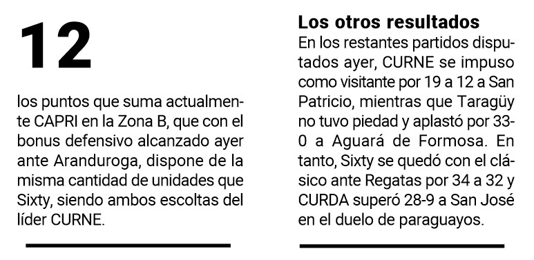Porque además, CAPRI fue superior a Aranduroga en las formaciones, ejerciendo supremacía en el scrum y tornando al maul en un problema difícil de controlar para la defensa de la “Cebra”, razón por la cual el equipo de Villa Cabello ganó muchos metros en campo rival cada vez que utilizó esa formación móvil.