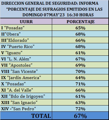 En ese sentido, la más participativa hasta ahora fue San Pedro, con un 72% de electores que ya habían cumplido su derecho cívico, seguida por Posadas (71%), y San vicente (70%).