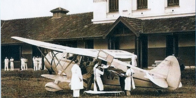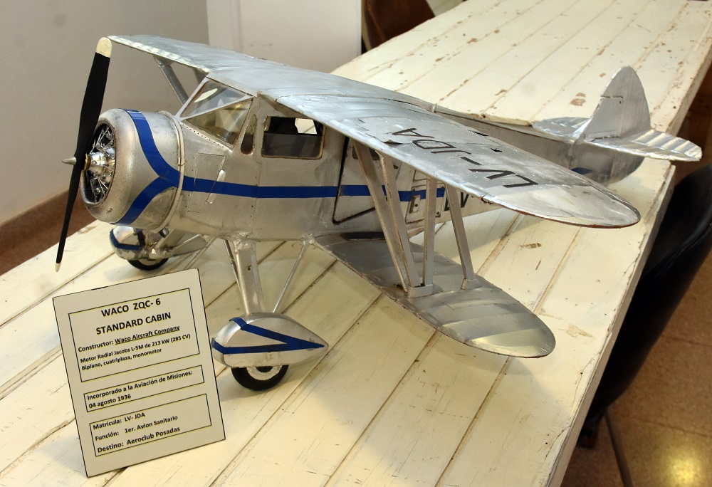 Esta tradicional fotografía retrata el momento en el que levanta vuelo, frente al pabellón central del hospital Madariaga, el WACO Custom, biplano, modelo ZQC-6, fabricado en 1936, equipado con motor Jacobs Aircraft Engine Co de Pottstown Pennsylvania USA, radial de siete cilindros y 285 HP, fabricado por la Weaver Aircraft Company, de cuyo acrónimo deriva el nombre del avión (WACo), con configuración sanitaria y varios accesorios importantes para aquellos tiempos, como indicador de giro, velocidad ascensional, derivómetro “Pionner”, velocidad crucero de 240 km/h y autonomía de 1360 kilómetros, lo que permitía cubrir en menos de cuatro horas, sin escalas, el trayecto entre Posadas y Buenos Aires y con la ventaja de poder decolar y aterrizar en pistas cortas y precarias.