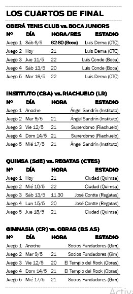 Vale resaltar que la serie de cuartos es al mejor de cinco partidos y que OTC buscará clasificar por primera vez a las semifinales de la Liga Nacional. Esa empresa requiere, justamente, de una victoria hoy por la noche en el recinto de la avenida San Luis. Lo ya dicho: caso contrario, Boca se pondrá 2-0 arriba y quedará a un triunfo de sentenciar el trámite.