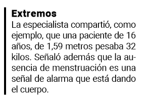 Así también se refirió a que evade la hora de compartir la comida en familia o en algún grupo, así como los cambios de humor. “Fijarse en la pérdida de peso. Hoy la moda nos juega en contra porque todo es oversize, es grande. He tenido pacientes que le mirabas al entrar y estaban bien, pero cuando se sacaban el buzo eran piel y hueso”, contó.