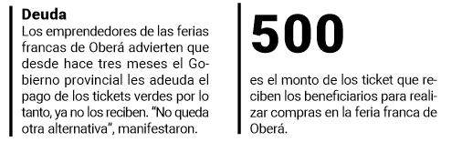 Crece el malestar en los emprendedores de las ferias francas de Oberá porque hace tres meses el Gobierno provincial les adeuda el pago de los tickets verdes. En consecuencia, ya no los reciben y consideran que si bien los beneficiarios “no son los culpables”, afirman que “no queda otra alternativa”.