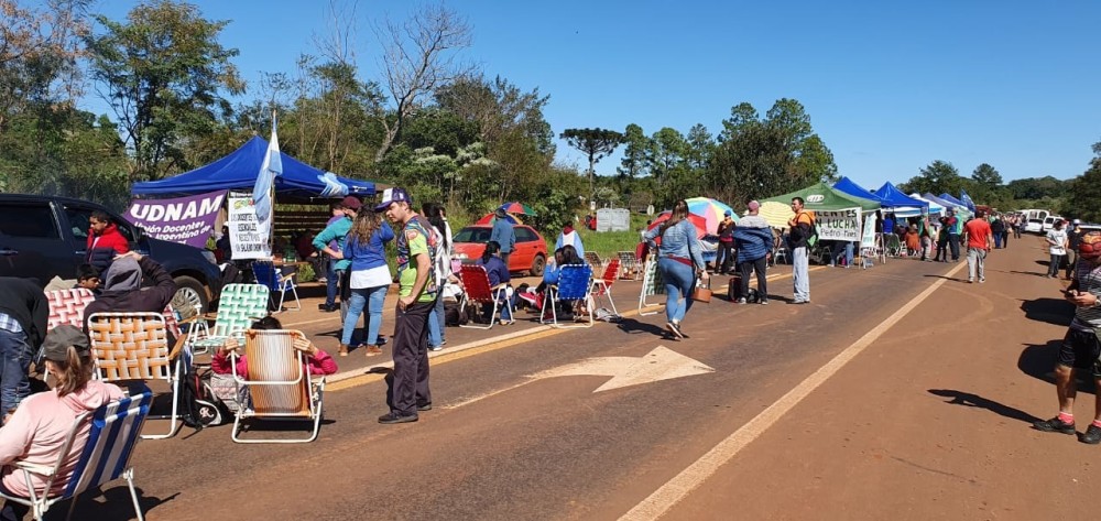 El Frente de Trabajadores de la Educación en Lucha (FTEL) llevan a cabo un corte total de la ruta nacional 14, en la localidad de San Vicente, en el marco del paro de 72 horas de esta semana.