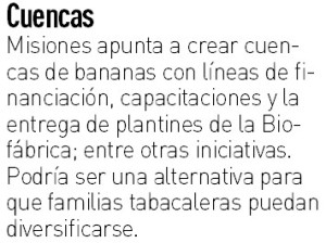La producción de bananas en Misiones hoy tiene su fuerte en la zona de Colonia Alberdi donde unos siete productores conforman esa cuenca. La fruta se comercializa luego en las chacras o en el mercado concentrador de Oberá, que es el punto más importante.