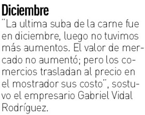 El empresario de la carne Gabriel Rodríguez, representante de la cooperativa frigorífica Virgen de Fátima, indicó que el precio de la carne en el mercado no sube desde diciembre, pese a los constantes aumentos que se observa en góndola.