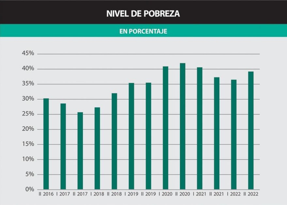 La reducción en el nivel de ingreso real repercute de manera directa en la pobreza. En el último semestre de 2022, la pobreza se incrementó en 270 puntos básicos; pasando de un 36,5% (17,3 millones) en el primer semestre a un 39,2% (18,7 millones). Por ende, en tan sólo 6 meses, 1,4 millones de personas pasaron a estar bajo la línea de la pobreza.