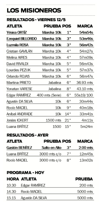 Con la medalla obtenida ayer por Benítez, Misiones alcanzó las cuatro preseas en lo que va del Nacional, después del triunfo que conquistó el viernes la eldoradense Yésica Ortíz en los 10 kilómetros de marcha. En esa misma prueba, Luzmila Rosa fue bronce, al igual que Ezequiel Billordo en la rama masculina.