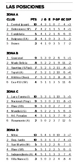 Por su parte, en la Zona A, Defensores de San Pedro igualó 2-2 con Atlético Candelaria y, un día antes, Central Iguazú superó por un ajustado 3-2 a Jorge Gibson Brown, resultado que le permitió sacar diferencia en lo más alto.
