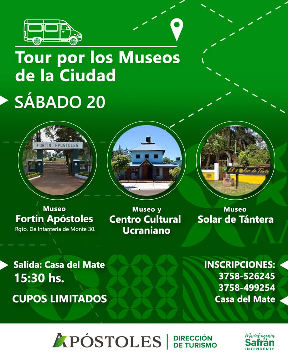 La apertura de las propuestas programadas será el sábado 20 de mayo, con un tour que saldrá desde la Casa del Mate a las 15.30, cuyo recorrido será por museos de la ciudad: Museo Fortín Apóstoles del Regimiento de Infantería de Monte 30; Museo y Centro Cultural Ucraniano y Museo Solar de Tántera.