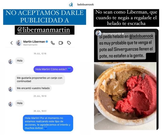En aparente “represalia” a esta respuesta, Liberman hizo mención de la heladería, pero con una crítica: “Si pedís helado en @ladobuenook es muy probable que te venga el pote así! Sinvergüenzas, llenen el pote, no estafen a la gente”.